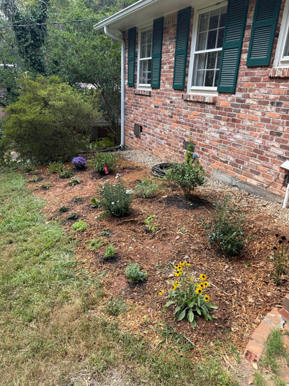This project was completed in stages, beginning with the flooding issues at the side door, then moving to a few border beds in the back and the front yards. Aside from managing water at the side of the house, the goal was to add color and biodiversity to areas of the yard that had been left incomplete after a recent outdoor remodel.